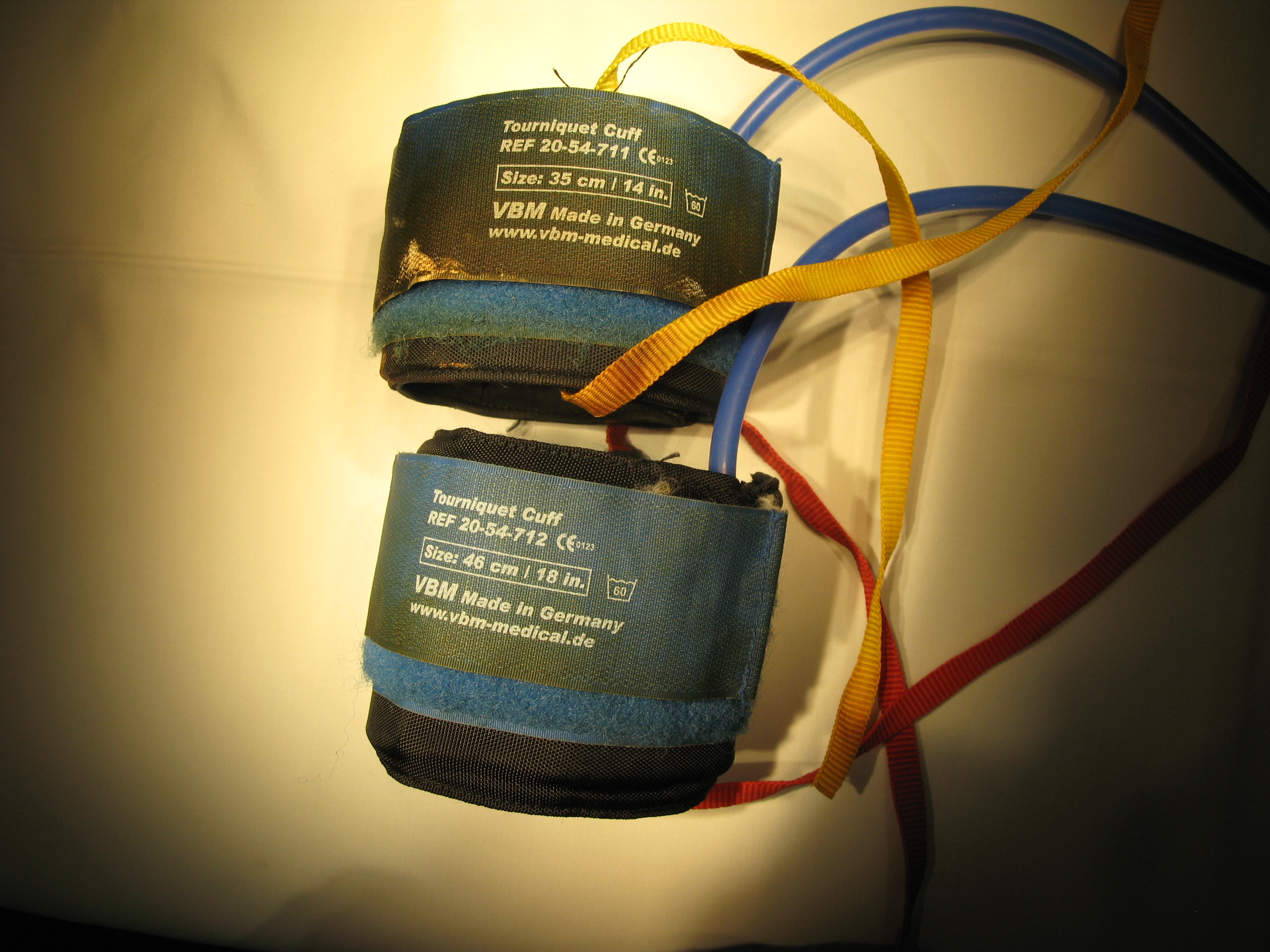 pour le bras (lacets rouges, 46 cm) et un plus petit plus distal pour